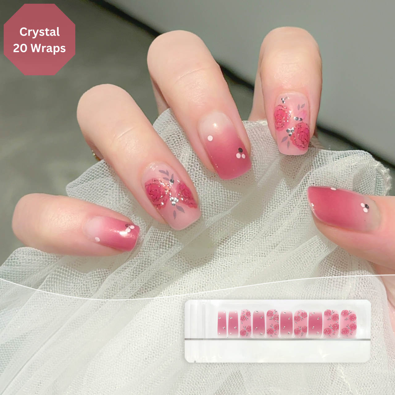 20 glossy nail wraps in 10 different sizes, can be used on both fingernails and toenails.
